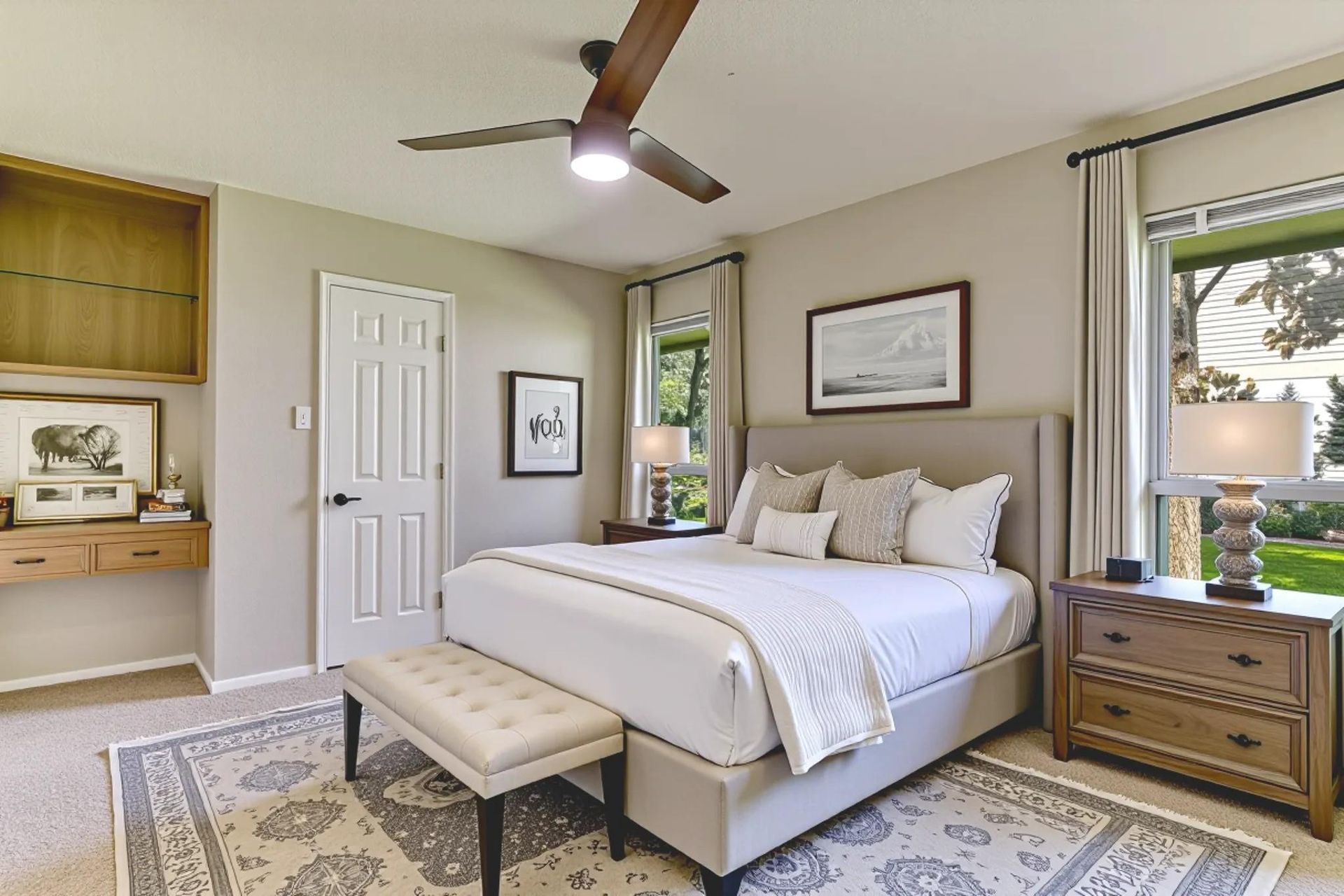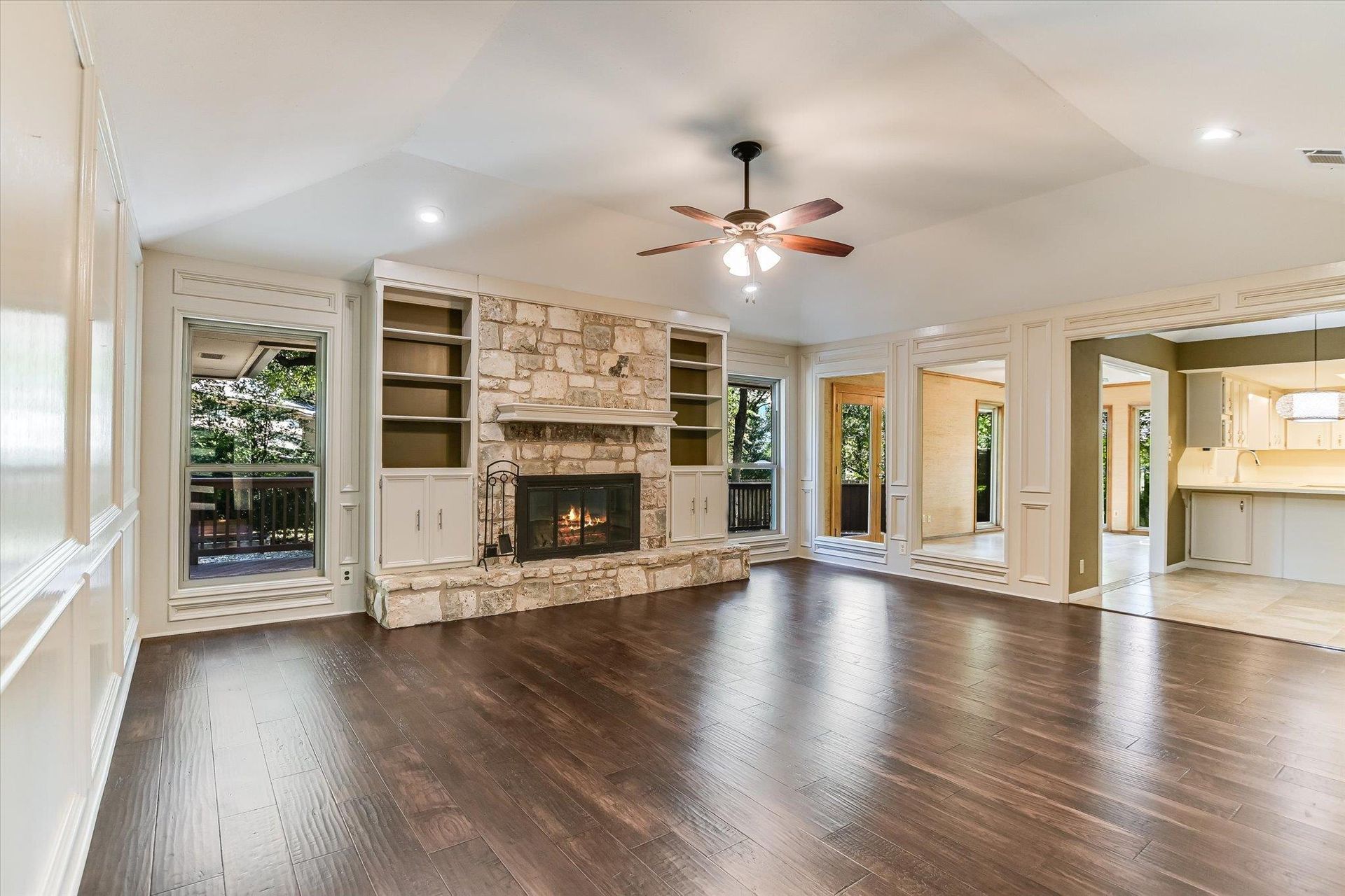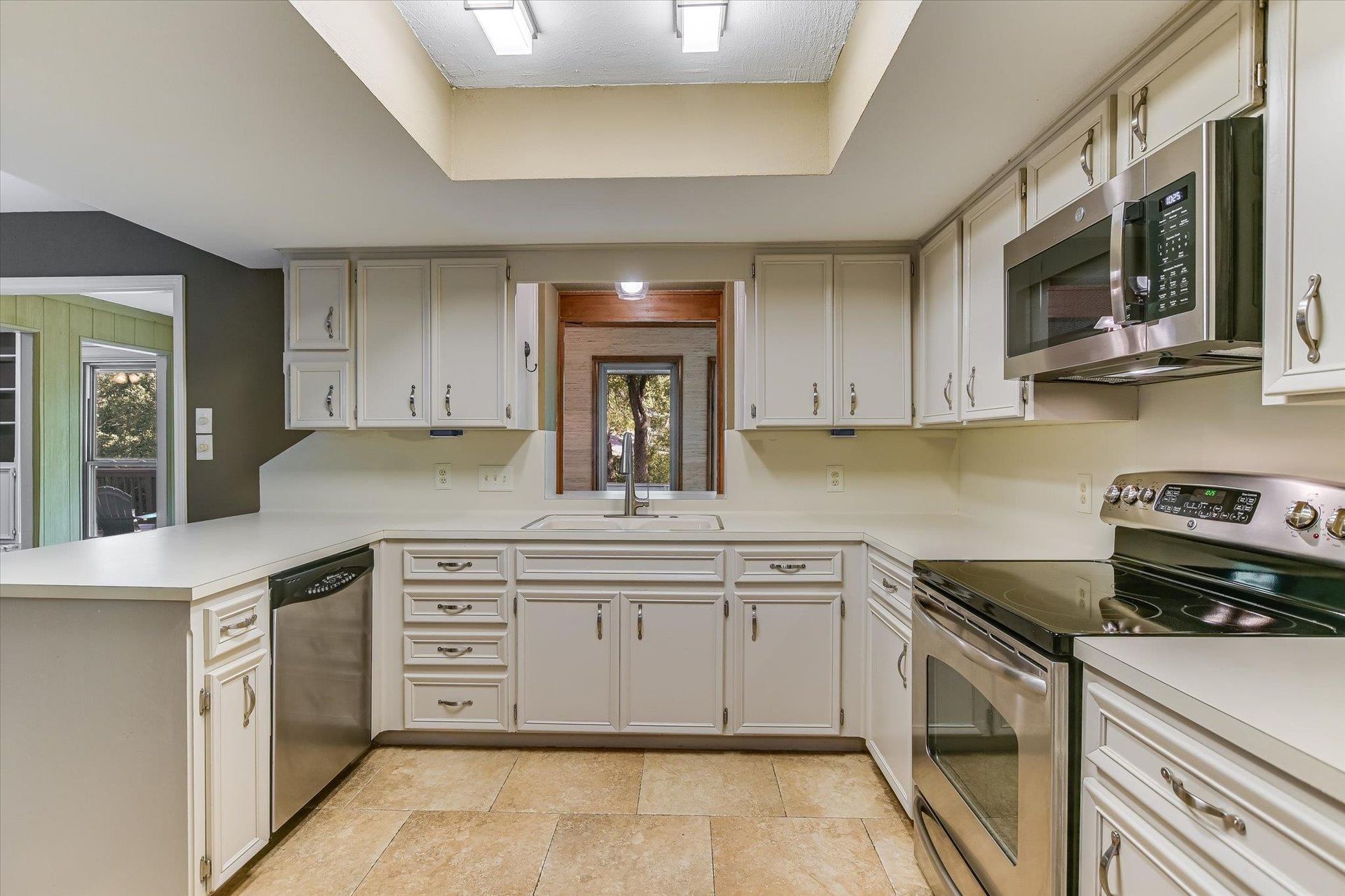 The living room serves as a focal point, offering a warm fireplace that invites cozy evenings, while the vaulted ceiling amplifies the sense of space, further complemented by thoughtfully placed built-in shelves ready to house your treasured books and belongings. In the kitchen, you'll find plentiful storage, while the tray ceiling adds a touch of architectural interest, and the kitchen peninsula and bar create a casual, inviting space for meals and conversation. The bathrooms offer both style and function, featuring double vanities for ease of use, a tiled walk-in shower for a spa-like experience, and bathtubs for relaxation.