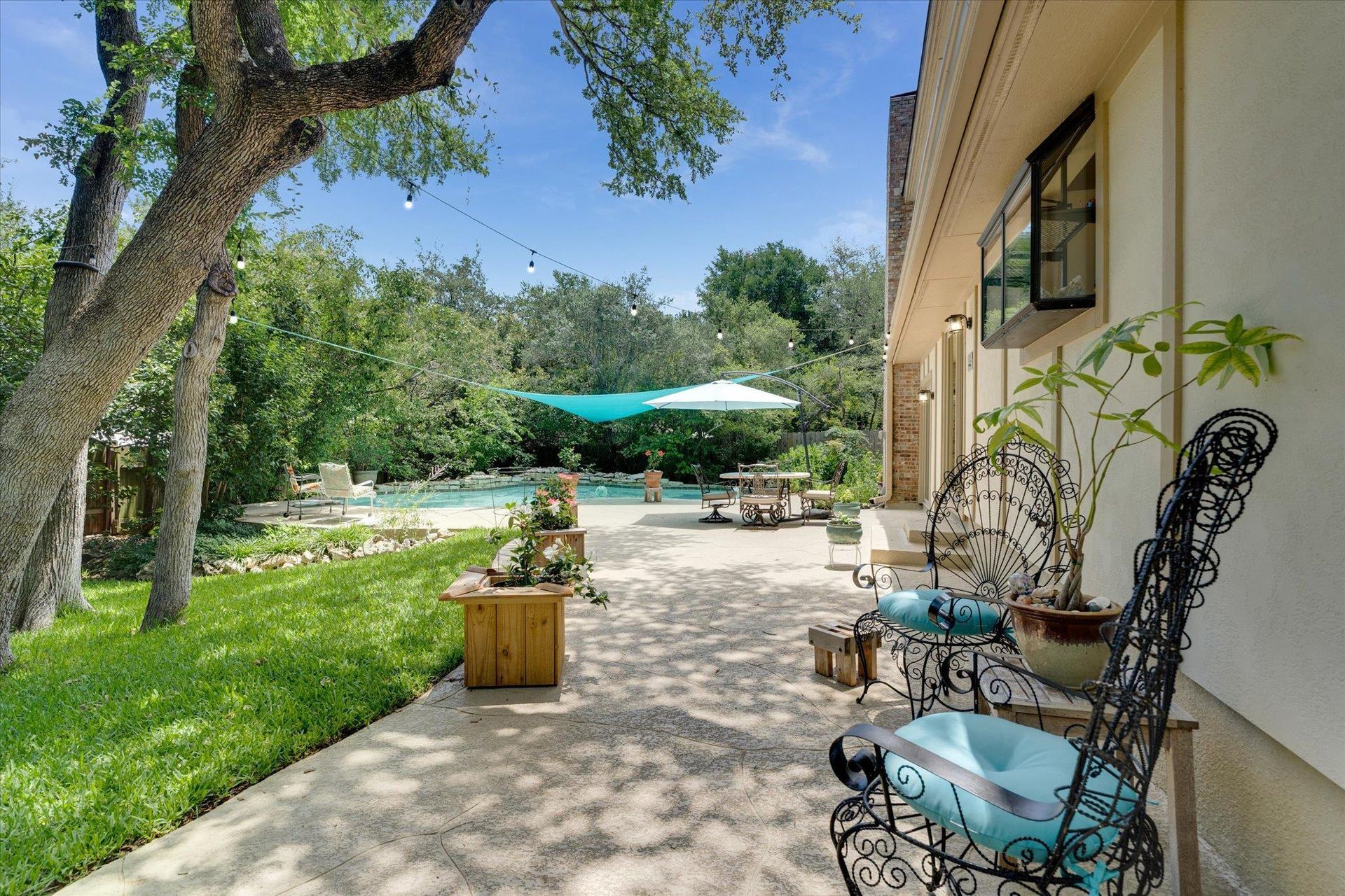 This gorgeous Tudor-style home in highly sought after Spicewood Estates is located in the top Round Rock school district, including Spicewood Springs Elementary, Canyon Vista Middle School, and Westwood High School. The home is walking distance to many neighborhood parks, tennis courts, and the Balcones Club golf course. And if you're looking for a "staycation location", look no further than the stunning backyard, where you'll find a private pool with waterfall, perfect for leisurely afternoons, and a large patio, ideal for outdoor entertaining.  You'll be able to relax in the lush landscaping while floating your cares away in the pool, and that lush landscaping is supported by a 150-gallon rain barrel water catchment system.