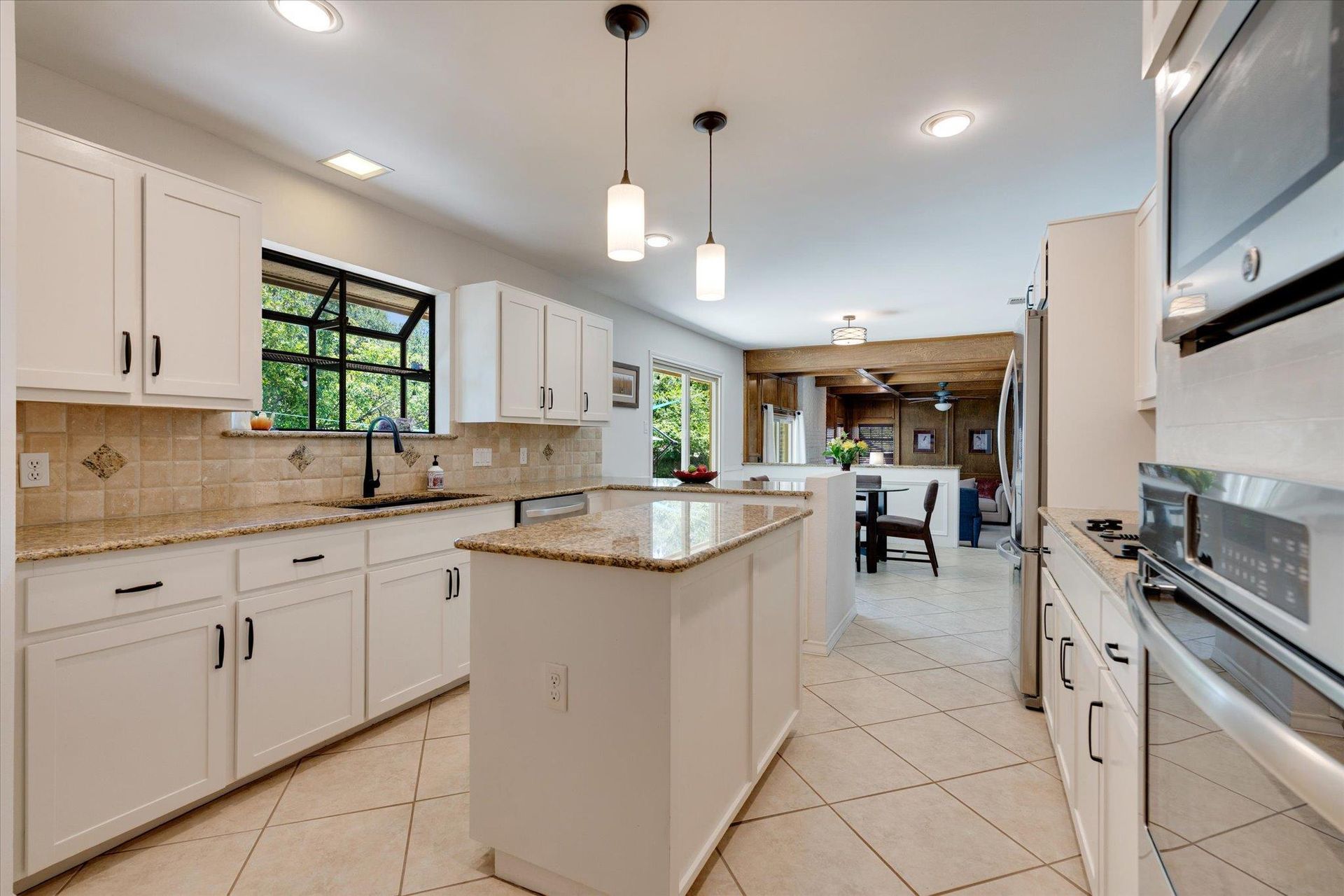 The heart of this home resides in its meticulously designed kitchen, where the backsplash complements the stone countertops, offering a refined aesthetic, and the large kitchen island invites gatherings and casual meals. The kitchen peninsula expands the counter space, and the shaker cabinets and large pantry provide ample storage. In the great room, the ambiance is one of warmth and sophistication, where a herringbone brick fireplace casts a comforting glow, and the beamed ceiling adds architectural interest; the wood walls add a touch of rustic charm, completing a space designed for relaxation and memorable moments. The wet bar area, with ample storage, creates a space that is both functional and visually stunning. The modern primary bathroom features double vanities and a large tiled walk in shower, and all 4 bedrooms are spacious with plenty of light.